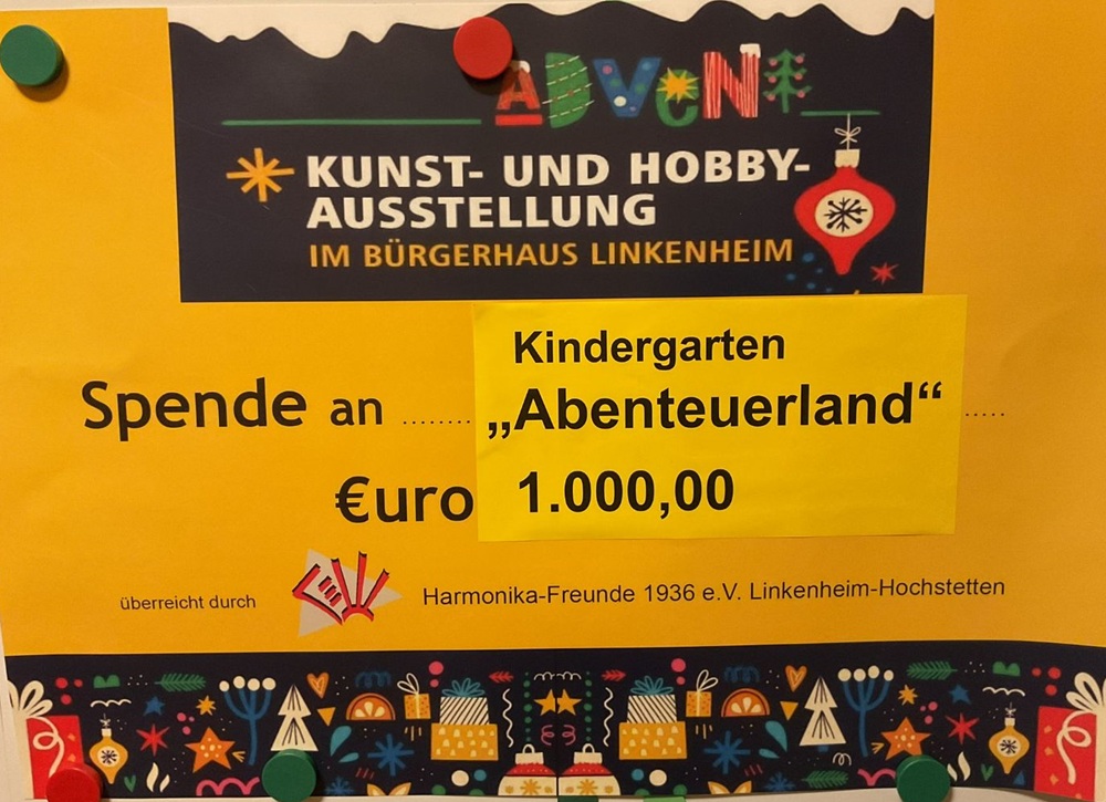 Die Kita "Abenteuerland" darf sich über eine großzügige Spende freuen! Dafür möchten wir uns im Namen unseres gesamten Teams, unseren Eltern und vor allem unserer Kinder ganz herzlich bei allen Ausstellern bedanken, die dies durch die Kunst- und Hobbyausstellung ermöglichen.
