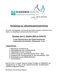 Der Diakonieverein Linkenheim-Hochstetten e.V. lädt alle Mitglieder und Freunde zur Jahreshauptversammlung 2025 ein.