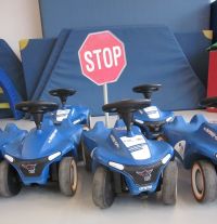Zum Schluss wurde es noch besonders lebendig: Die Kinder durften mit Bobby Cars und Elektro Autos selbst Auto fahren und Fußgänger spielen. So konnten sie in einem kleinen Rollenspiel zeigen, was sie gelernt hatten – mit viel Spaß und Bewegung.
